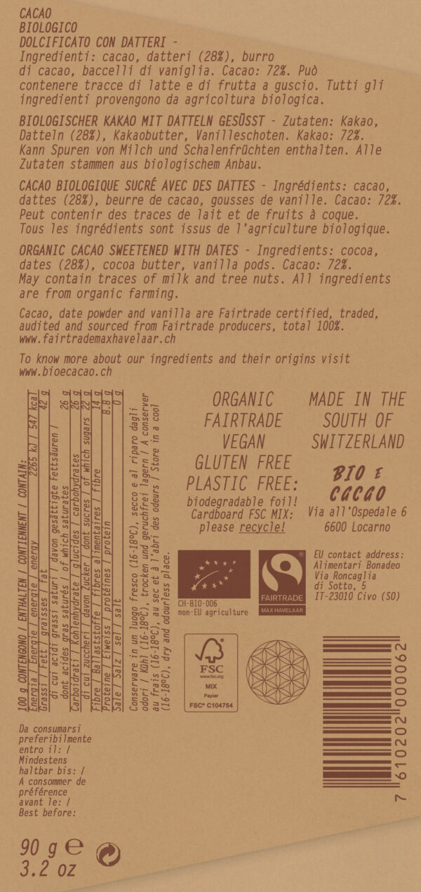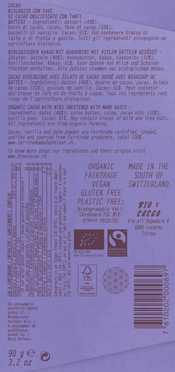 Organic Cacao Sweetened with Dates – Cacao butter 45%