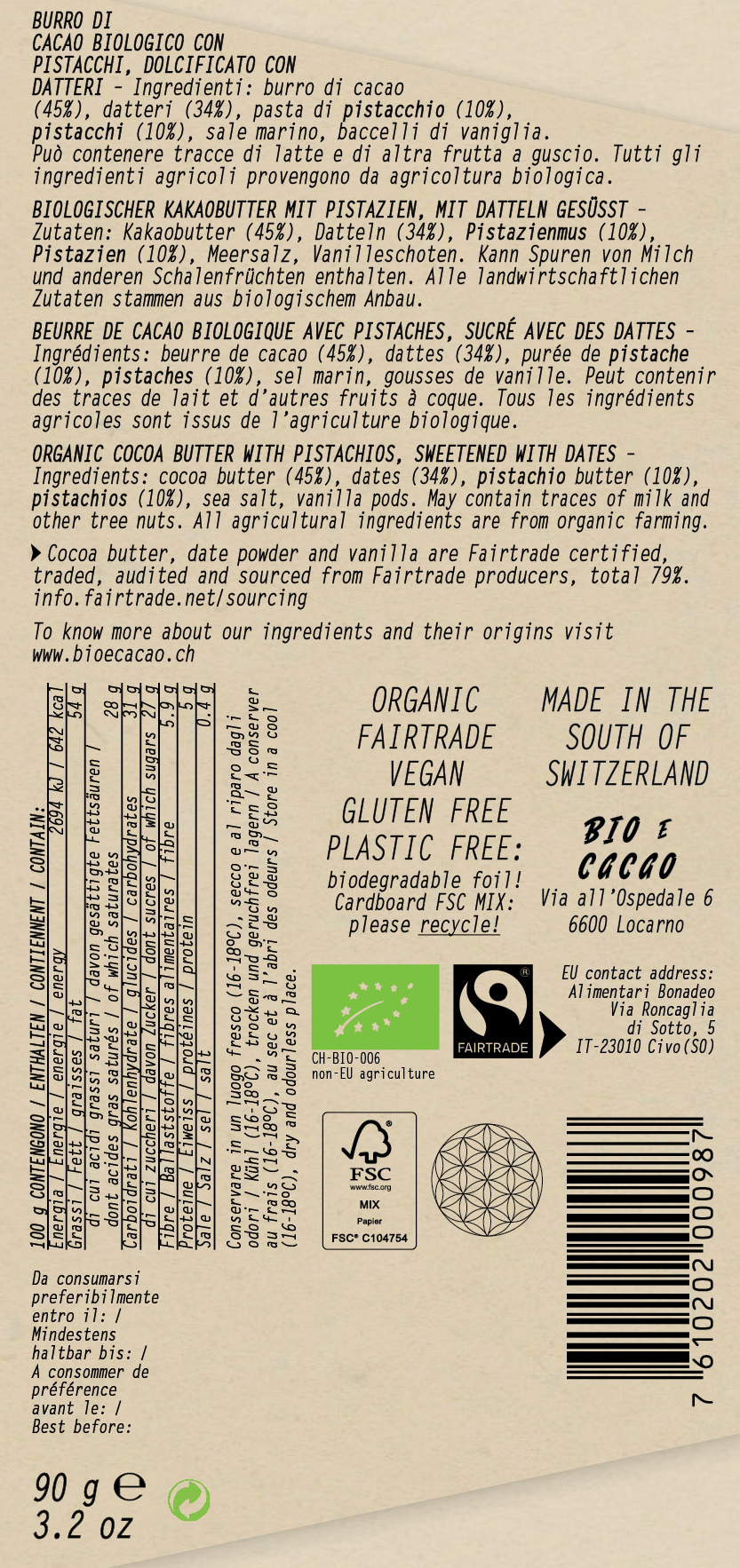 Ingredients: cocoa butter (45%), dates (34%), pistachio butter (10%), pistachios (10%), sea salt vanilla pods. May contain traces of milk and tree nuts. All agricultural ingredients are from organic farming.